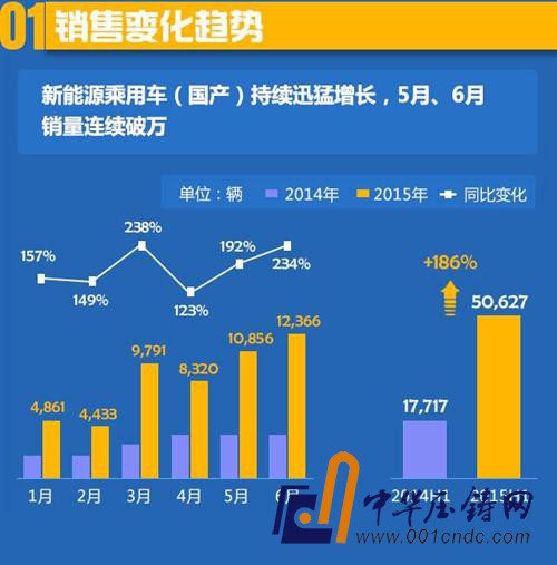 根據(jù)蓋世汽車網(wǎng)整理的數(shù)據(jù),2015年1-6月,整個上半年,我國國產(chǎn)新能源乘用車完成銷售50,627輛,比去年同期增長185.8%。這主要得益于近年來中央和地方的大力扶持作用,使得私人消費市場升溫,市場產(chǎn)品種類、數(shù)量日益增多,國內(nèi)新能源汽車產(chǎn)銷快速增長。