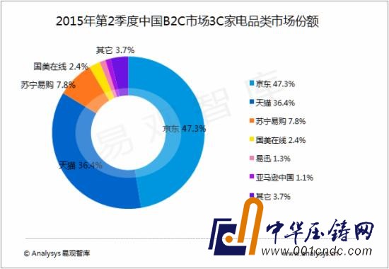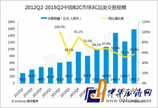根據Analysys易觀智庫發布的《中國B2C市場季度監測報告2015年第2季度》數據顯示,2015年第2季度,中國B2C市場3C品類交易規模為1592.2億元人民幣,同比增長56.7%。