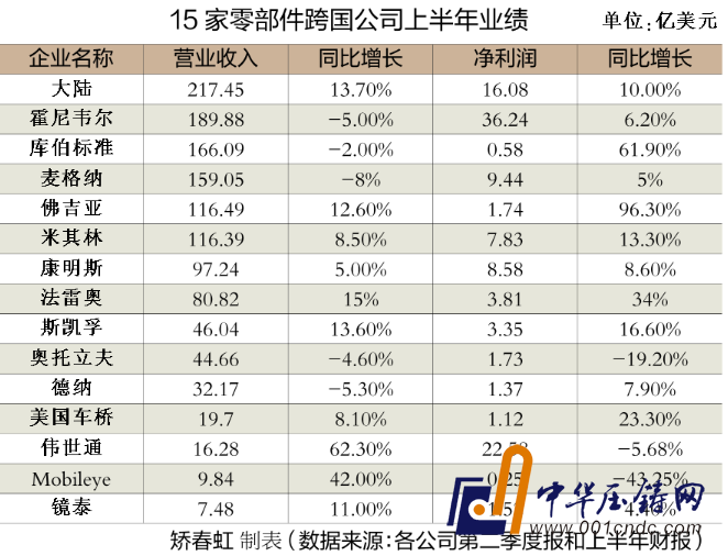 當前已進入汽車零部件上市公司上半年業績的密集披露期,截至目前,本報記者收集整理了15家零部件跨國公司上半年業績數據。統計結果顯示,15 家跨國公司中有11家今年上半年營業收入保持同比增長,總體業績表現良好。基于此,大部分跨國公司在財報中表示將會上調全年營業收入預期。