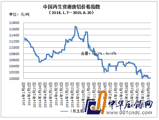 今日中國再生資源廢鋁價格指數(shù)10017元/噸,與昨日相較持平。人民幣貶值令鋁價承壓,原料相對充足,廢鋁市場繼續(xù)維持平穩(wěn),但現(xiàn)貨鋁下滑加大廢鋁價格壓力,市場成交不旺。