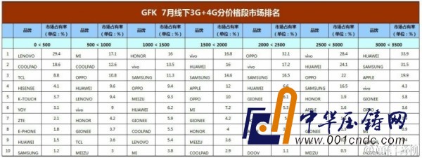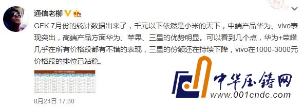 @通信老柳 表示:GFK 7月份的統計數據出來了,千元以下依然是小米的天下,中端產品華為、vivo表現突出,高端產品方面華為、蘋果、三星的優勢明顯。可以看到幾個點,華為+榮耀幾乎在所有價格段都有不錯的表現,三星的份額還在持續下降,vivo在1000-3000元價格段的排位已站穩。
