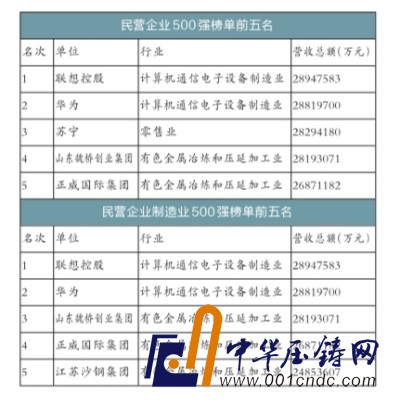 在發(fā)布中國民營企業(yè)500強(qiáng)榜單的同時,工商聯(lián)還發(fā)布了2015年民營企業(yè)制造業(yè)500強(qiáng)。具體來看,聯(lián)想控股、華為、山東魏橋創(chuàng)業(yè)集團(tuán)排名前三;廣東的有色金屬冶煉企業(yè)正威國際集團(tuán)排名第四,其營收達(dá)2687.12億;江蘇沙鋼排名第五,營收達(dá)2485.36億。