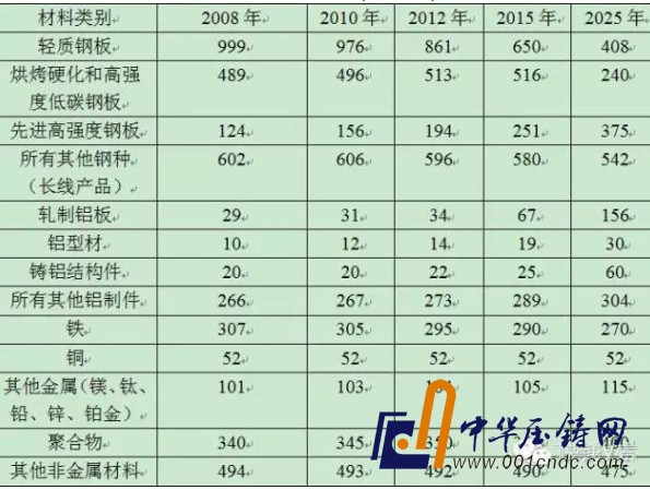咨詢企業(yè)DuckerWorldwide公司發(fā)表的一份預(yù)測(cè)平均每輛輕型車所用材料凈重量變化(見表1)的報(bào)告時(shí)估計(jì),鎂合金零部件將從2008年的每車8磅左右增加到2025年的22磅。這種用量的增加將全部集中在傳動(dòng)零部件上(主要是進(jìn)氣歧管)。鎂合金傳動(dòng)件和傳動(dòng)箱可能最終將會(huì)取代鋁合金傳動(dòng)件和傳動(dòng)箱,但不會(huì)用于制造結(jié)構(gòu)件。