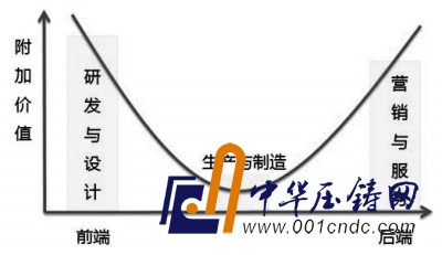 微笑曲線將一條產(chǎn)業(yè)鏈分為三個區(qū)間,即研發(fā)與設計、生產(chǎn)與制造、營銷與服務,其中生產(chǎn)制造環(huán)節(jié)總是處在產(chǎn)業(yè)鏈上的低利潤環(huán)節(jié)。