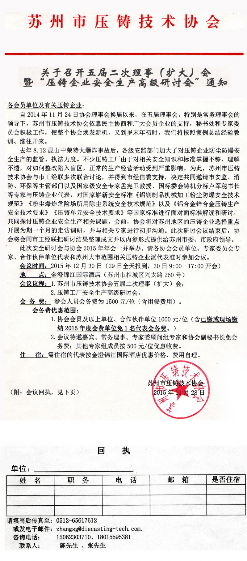 蘇州市壓鑄技術協(xié)會召開年會暨安全生產(chǎn)高級研討會通知