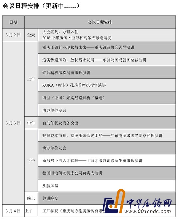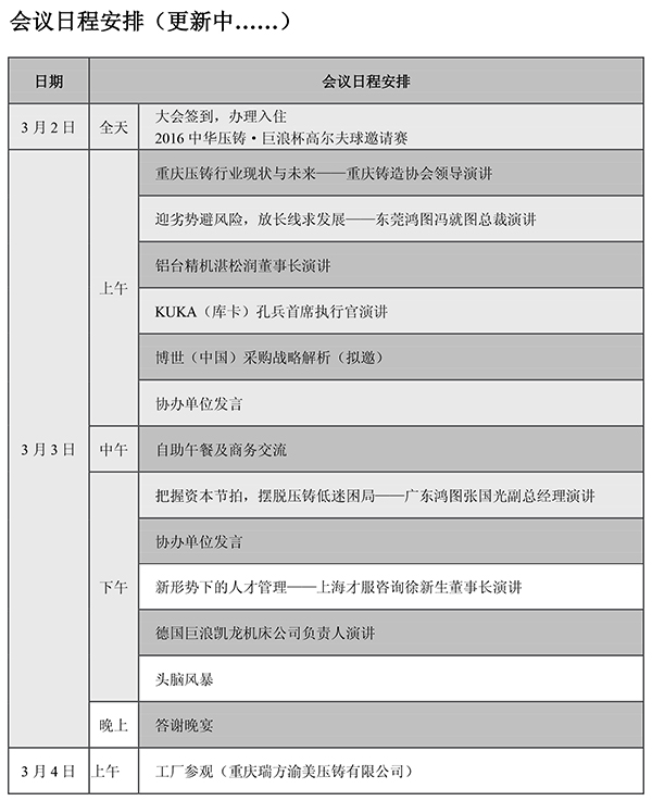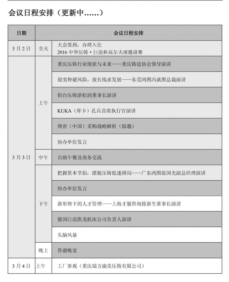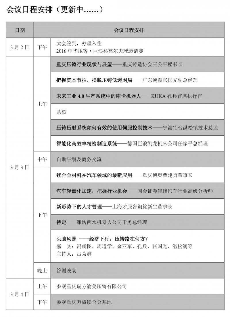 隨著國家《中國制造2025》戰略出臺,許多企業借此政策東風,開始“智”造轉型升級。但受宏觀經濟大環境影響,中國的制造業仍存在產能過剩嚴重、投資效率偏低、出口競爭力下降、自主創新不足等問題。辭舊迎新,重慶鑄造行業協會與中華壓鑄網定于2016年3月2日— 4日在重慶舉辦“2016中國(重慶)壓鑄產業發展大會”,本次大會以“市場·智能·人才·資本”為主題,以壓鑄企業企業家為對象,由主旨演講、高端訪談、專題論壇、頭腦風暴等系列活動組成,為壓鑄企業謀求更好的發展,在探索合作下,實現共贏。