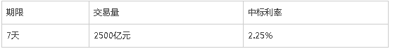中國央行今日進行2500億元7天期逆回購操作,中標利率為2.25%。另外,公開市場今日有400億元7天期逆回購到期。央行今日公開市場凈投放2100億元,創近兩個月單日投放高點。