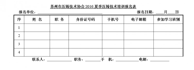 (一)登錄《中國壓鑄技術(shù)網(wǎng)》(www.diecasting-tech.com)下載“蘇州市壓鑄技術(shù)協(xié)會(huì)2016夏季壓鑄培訓(xùn)報(bào)名表”,或關(guān)注微信訂閱號(hào)“蘇州壓鑄”獲取報(bào)名信息,將報(bào)名表通過電子郵件返回蘇州市壓鑄技術(shù)協(xié)會(huì)。