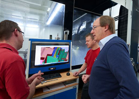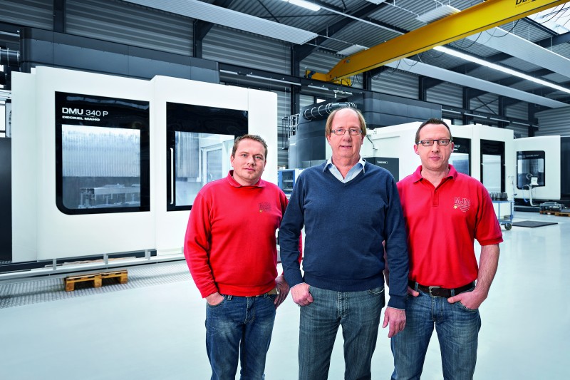 Jürgen Mangner(中),MJM Metallverarbeitung Mangner公司企業(yè)主和它的員工Andreas Pfaffenroth(左)及Christoph Lenz在2014年安裝的兩臺DMU 340 P前。