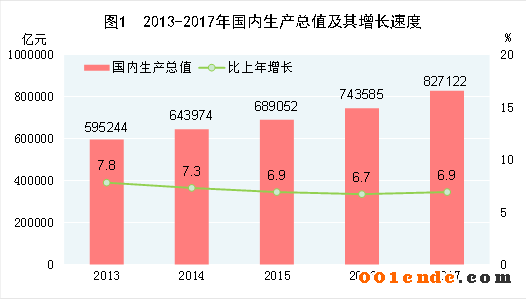國家統計局今日發布《中華人民共和國2017年國民經濟和社會發展統計公報》,公報顯示,初步核算,全年國內生產總值827122億元,比上年增長6.9%。其中,第一產業增加值65468億元,增長3.9%;第二產業增加值334623億元,增長6.1%;第三產業增加值427032億元,增長8.0%。