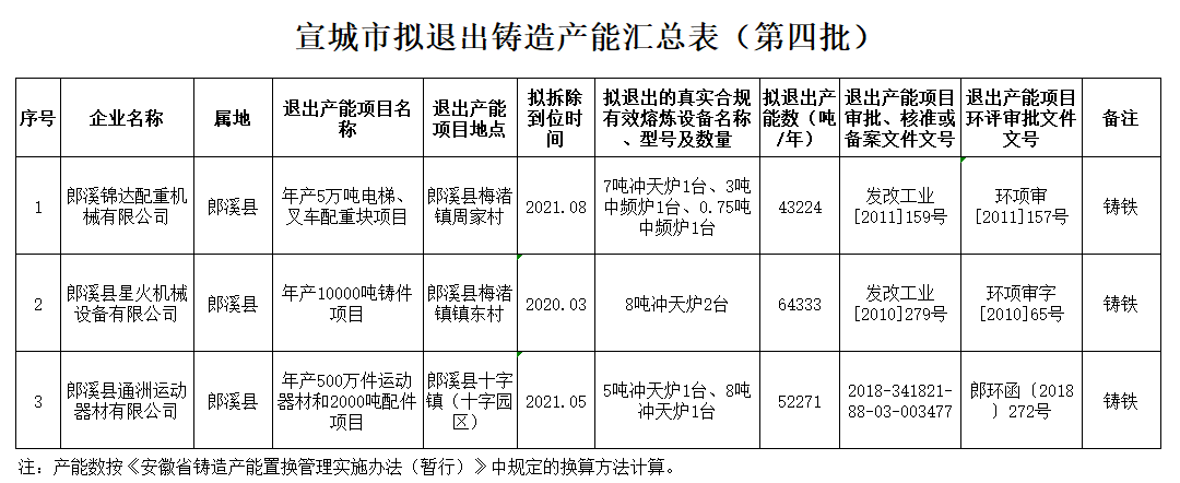 宣城市經濟和信息化局消息,宣城市擬退出鑄造產能公示: