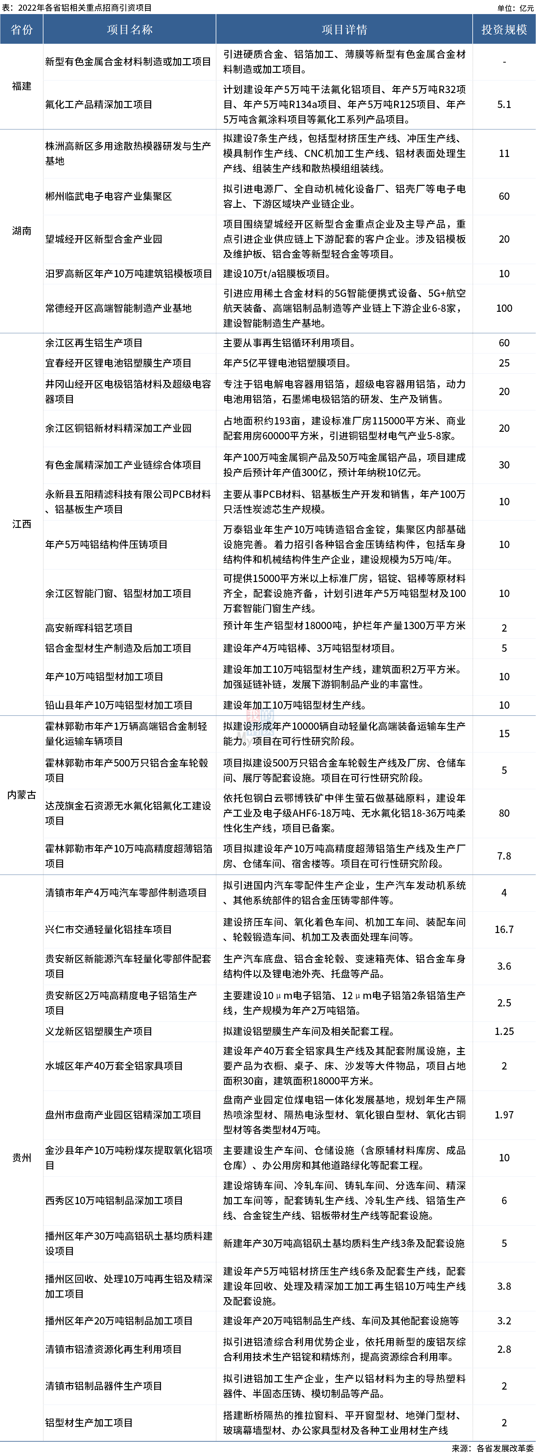 近期各地陸續發布2022年重點招商項目清單,據Mysteel不完全統計,截至5月26日,共有5個省份發布的2022年重點招商項目清單中涉及鋁相關項目,合計共39項,總投資規模592億元。