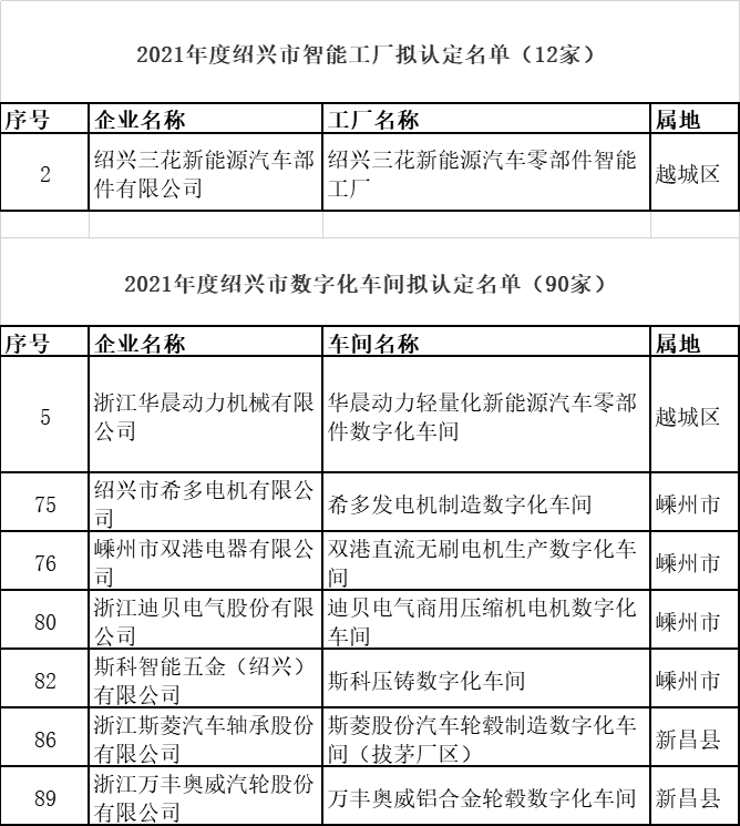 紹興市經濟和信息化局6月1日發布《關于2021年度紹興市智能工廠、數字化車間擬認定名單的公示》,以下企業上榜: