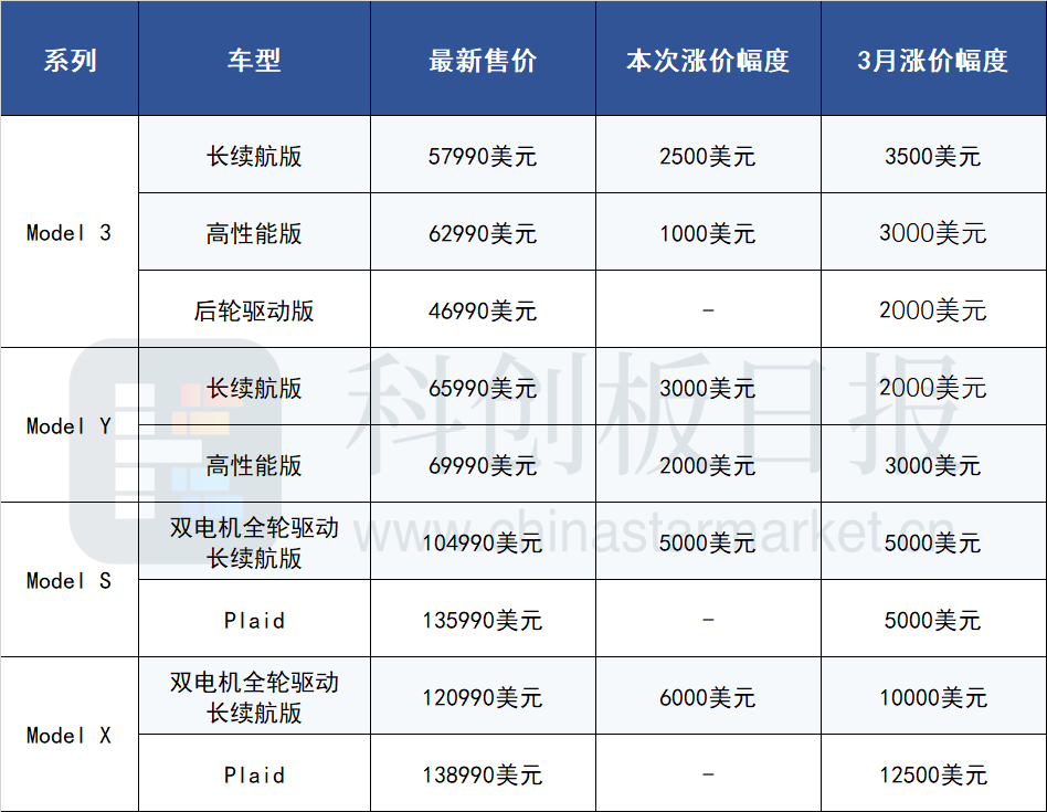 據(jù)汽車新聞網(wǎng)站Electrek報(bào)道,特斯拉已大幅提高了旗下所有電動(dòng)汽車的價(jià)格,其中一些車型的價(jià)格上漲了6000美元。其中:Model 3長(zhǎng)續(xù)航版提價(jià)2500美元,至57990美元;Model Y長(zhǎng)續(xù)航版售價(jià)從62,990美元漲至65,990美元;Model Y性能版售價(jià)從67990美元上升到69990美元;Model S雙電機(jī)全輪驅(qū)動(dòng)長(zhǎng)續(xù)航版的價(jià)格從99990美元漲到了104990美元;Model X雙電機(jī)全輪驅(qū)動(dòng)長(zhǎng)續(xù)航版的價(jià)格從114990美元上漲到120990美元,漲幅6000美元。