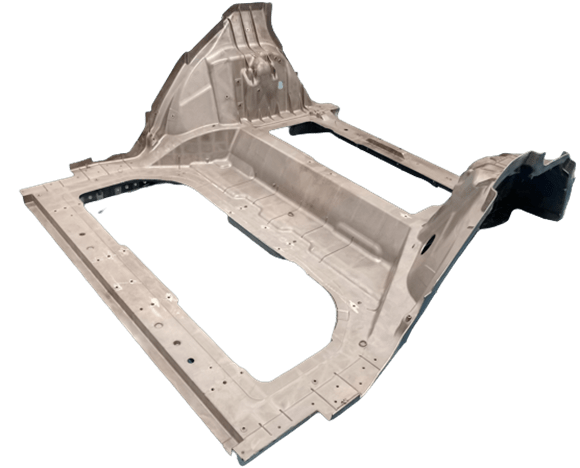此次獲獎的產(chǎn)品通過超大型高壓鑄件采用巨型壓鑄機一體式生產(chǎn),替代了超過200多個初始鈑金沖壓零件,通過SPR+FDS+螺接連接方式實現(xiàn)與周邊白車身零件的連接,為各配接零件提供安裝功能。鑄件表面整齊,看不到額外的螺栓、鉚釘、焊縫等,具有集成度高、有效載荷大、重量輕等優(yōu)點,可應(yīng)用于車身部件等大型薄壁殼體結(jié)構(gòu),尺寸達1630×1601×740mm,重量54公斤,材料為AlSi7Mg,平均壁厚3mm,是迄今為止市面上尺寸最大的后地板之一。