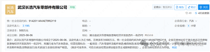 8月6日,武漢長浩汽車零部件有限公司成立,法定代表人為王書嶼,注冊資本為500.00萬元,經營范圍包括: 汽車零部件及配件制造等。通過快查APP股權穿透,該公司為長華集團全資子公司。