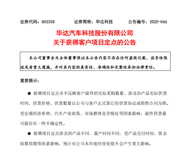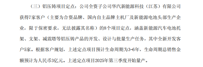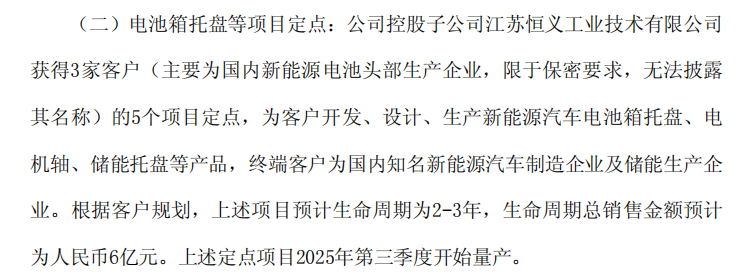 華達科技控股子公司江蘇恒義工業技術有限公司獲得3家客戶的5個項目定點,預計生命周期為2-3年,該生命周期總銷售金額預計為人民幣6億元。上述定點項目2025年第三季度開始量產。