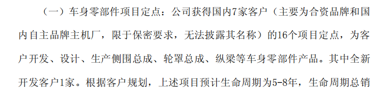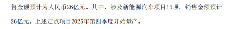獲得國內7家客戶的16個項目定點,預計生命周期為5-8年,該生命周期總銷售金額預計為人民幣26億元。其中,涉及新能源汽車項目15項,銷售金額預計26億元。上述定點項目預計2025年第四季度開始量產。