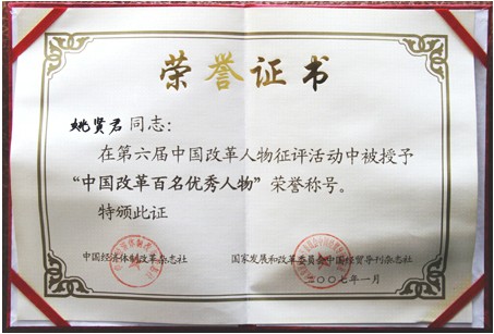 在姚總簡(jiǎn)單而又不失雅致的辦公室里,記者看到展示柜上擺滿了各類獎(jiǎng)狀和證書,其中有一張?zhí)貏e醒目,就是姚賢君在2007年被授予 “中國(guó)改革百名優(yōu)秀人物”榮譽(yù)稱號(hào),受到了國(guó)家有關(guān)領(lǐng)導(dǎo)人的接見。這足以說(shuō)明姚賢君在創(chuàng)業(yè)后的這些年,勇于改革的沖勁。