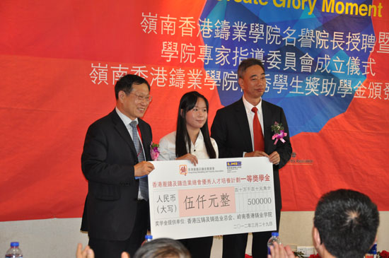 2012年3月29日,嶺南香港鑄業學院名譽院長授聘暨學院專家指導委員會成立儀式、嶺南香港鑄業學院優秀學生獎助學金頒發儀式在嶺南香港鑄業學院3樓大課堂隆重舉行,共鑄榮耀一刻。香港壓鑄及鑄造業總會會長譚哲豪先生、永遠榮譽會長李遠發先生、永遠名譽主席姜永正博士、常務副會長謝國夫先生等一行15人前往嶺南職院參加儀式。嶺南職院校長俞仲文先生,黨委書記丁紀平先生,執行校長鐘燕鋒先生,副校長李峻先生、朱敏女士、杜文宇先生等校領導和鑄業學院2011級全體學生,2009、2010級50名獲獎學生代表出席儀式。