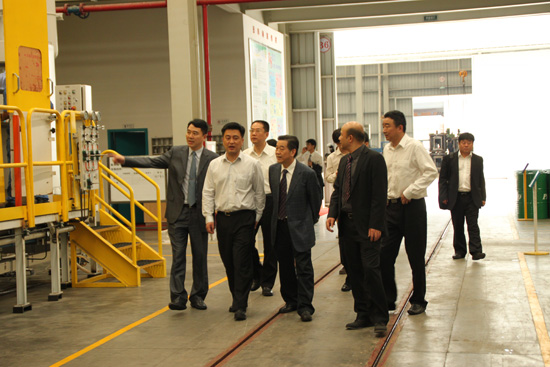 公司高層陪同路市長一行在超大壓鑄機(jī)裝配車間參觀,左一為集團(tuán)CEO曹陽先生,左二為路軍市長,左三為集團(tuán)創(chuàng)始人劉相尚先生,右一為華南市場部銷售總監(jiān)鄧毅明先生。