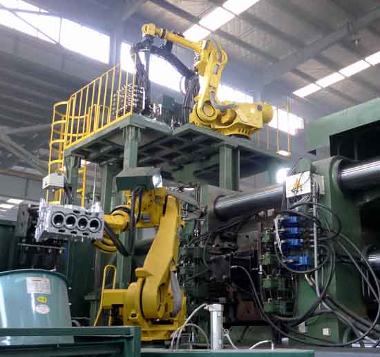 淘汰了部分硬件落后的設備,引進了具有世界先進水平大型壓鑄島,其中1600噸、2500噸、3000噸全自動壓鑄島,用于汽車缸體和下缸體的壓鑄生產,每座壓鑄島由2個日本法蘭克機器人組成,集鑲件高頻加熱、鑲件放置、壓鑄、產品追溯性打碼、去除澆口、產品降溫、產品傳送等功能。